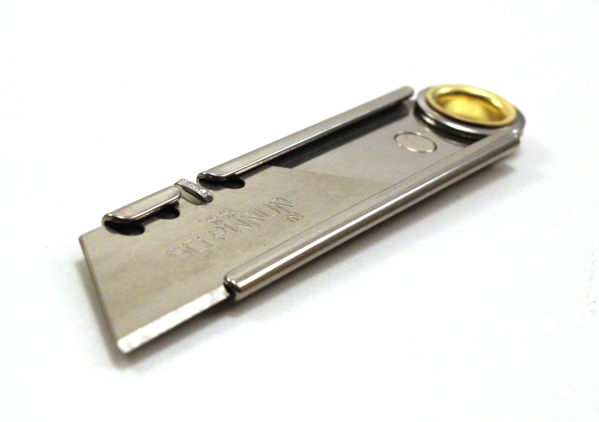Ron’s Utility Knife 3.0 fits standard utility blades (2 or 4 notched) and allows up to four controlled depths of cuts. Its ingenious lever system (along with the addition of an ultra-strong neodymium magnet) serves as a blade stop and catch.